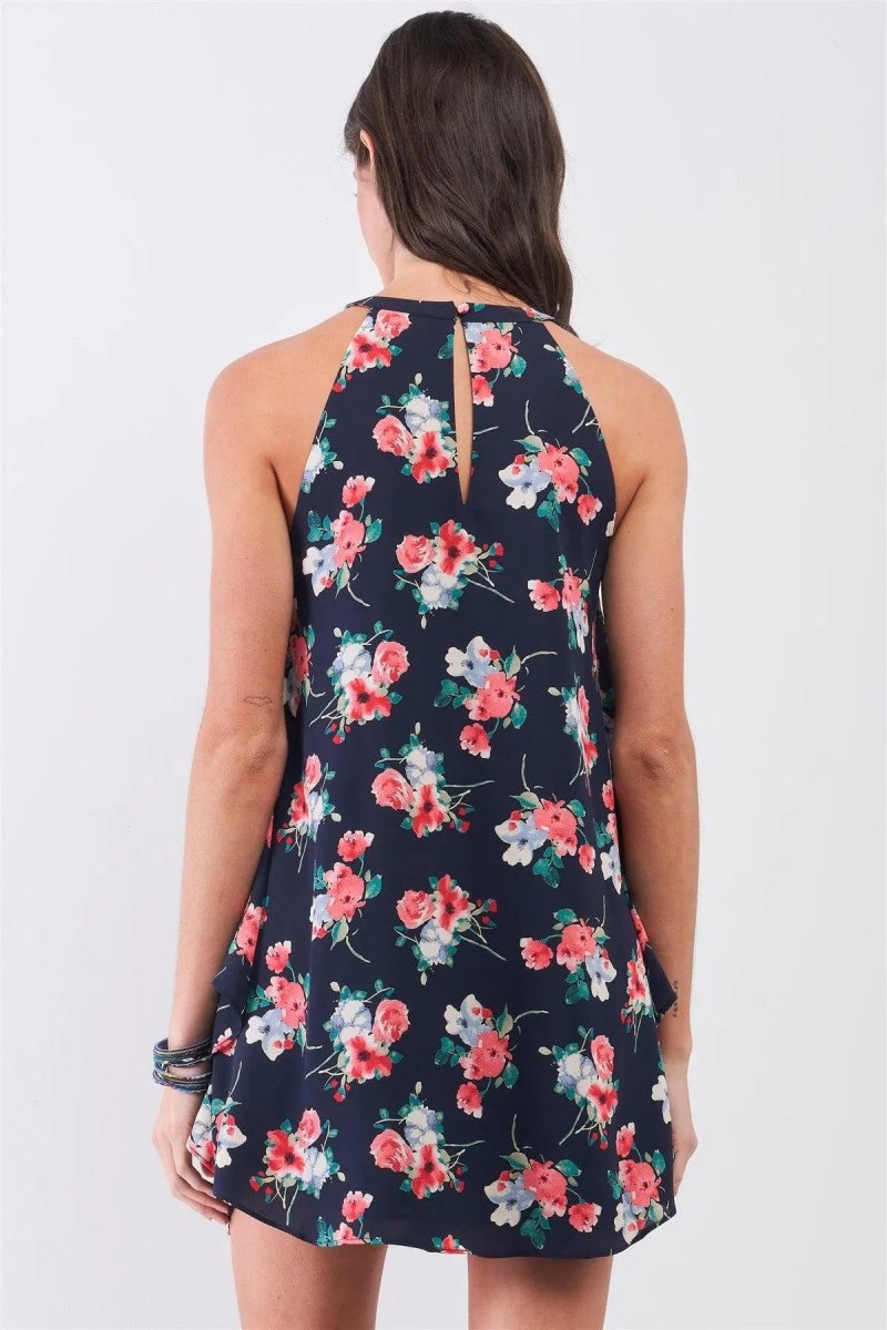 Design: Navy Multi Floral Print Sleeveless High Neck Layered Front Detail Flounce Mini Dress — a feminine and flirty mini dress featuring a beautiful floral print, sleeveless design, and layered front detail.