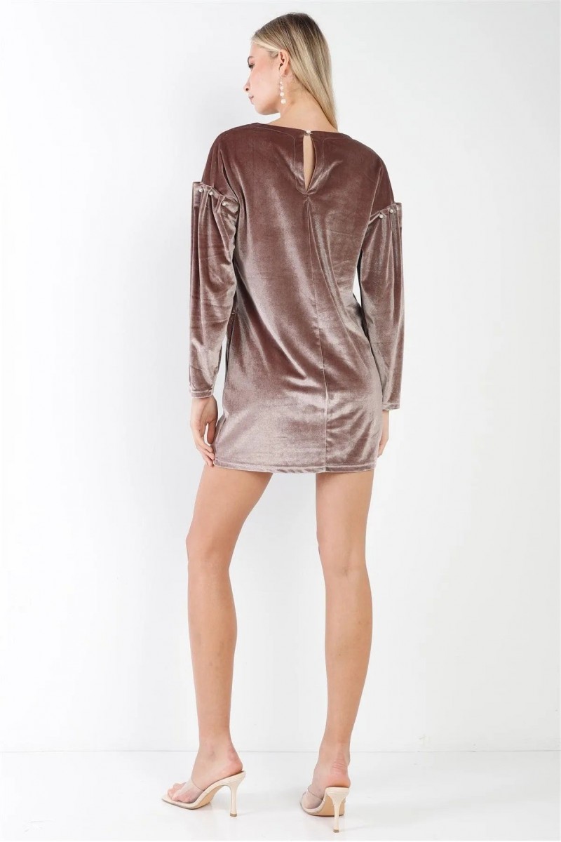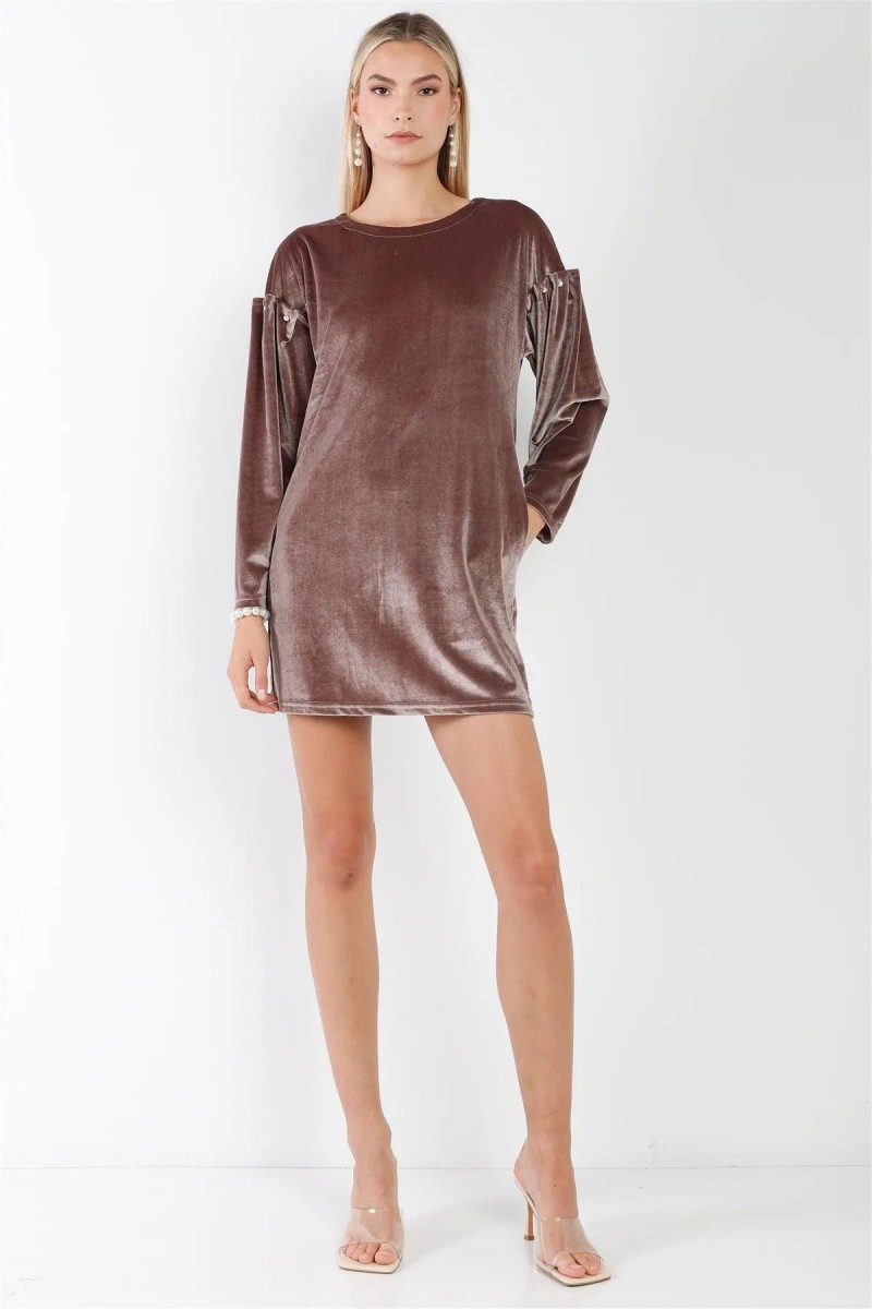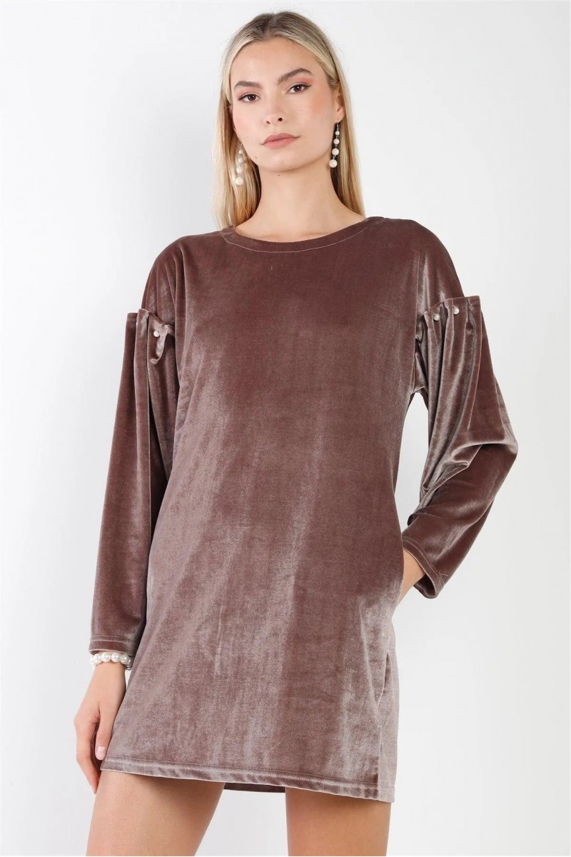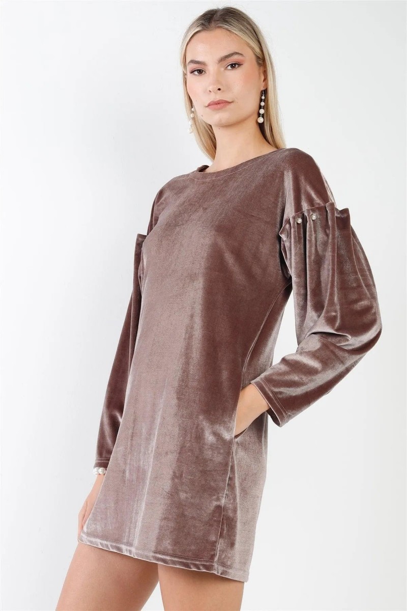 Design: Cocoa Velvet Long Sleeve Pearl Detail Mini Dress — an elegant mini dress crafted from luxurious velvet, featuring stunning pearl embellishments.