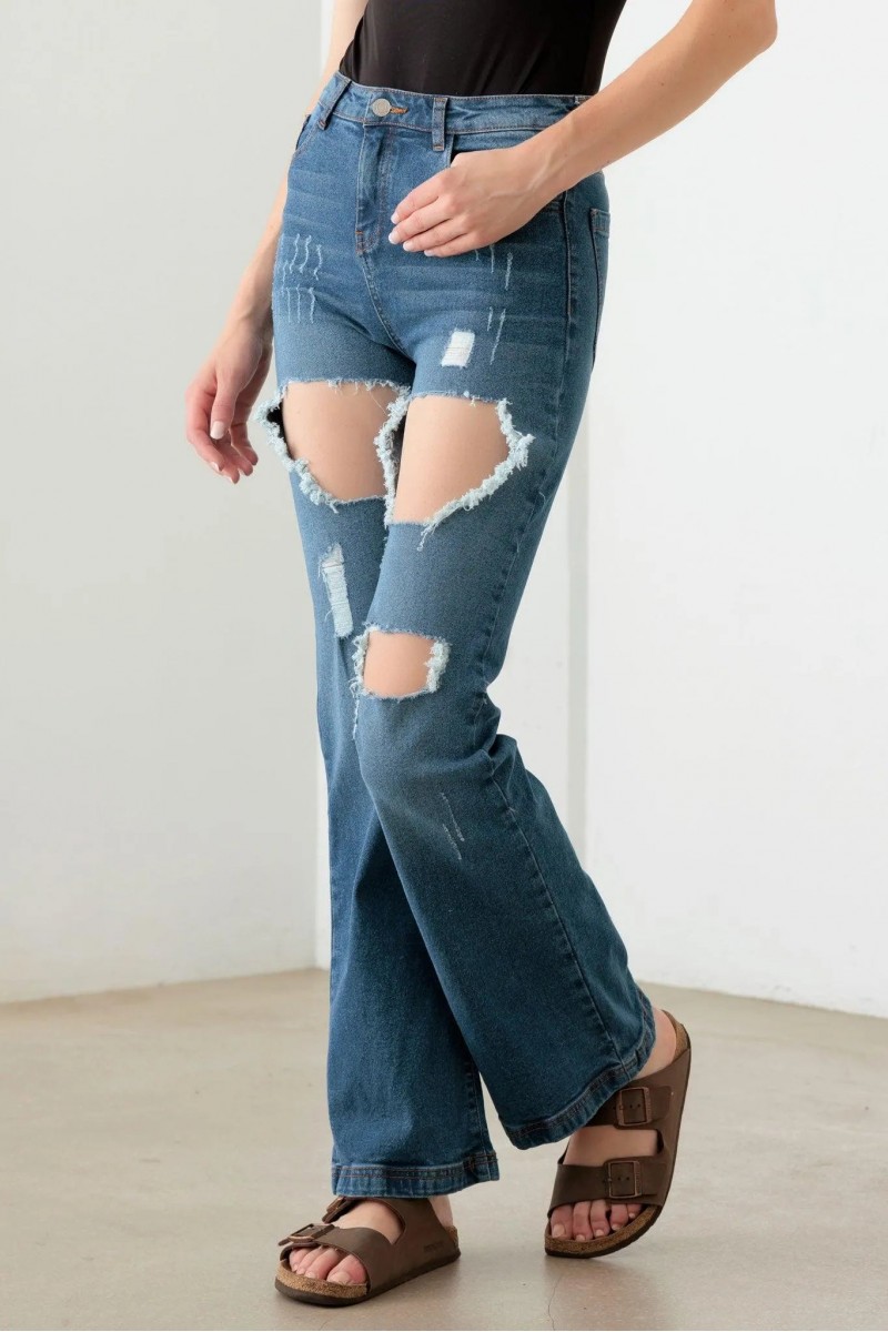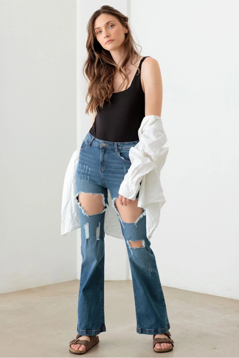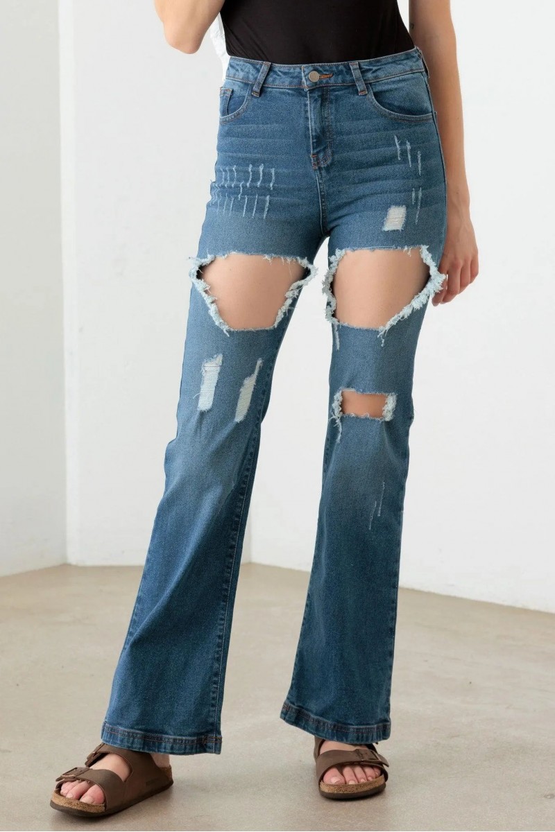 Step up your denim game with these bold and trendy distressed high-rise flared jeans. Perfect for making a statement, these jeans combine comfort, style, and a touch of edge to elevate any outfit.
