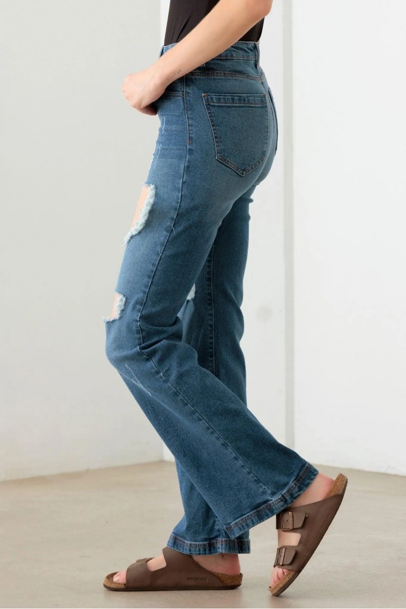 These jeans feature a high-rise fit that sits comfortably at the waist, providing a flattering silhouette. The flared leg design adds a retro-inspired touch, while the dramatic rips and distressed detailing at the thighs and knees give these jeans a unique, rugged charm.