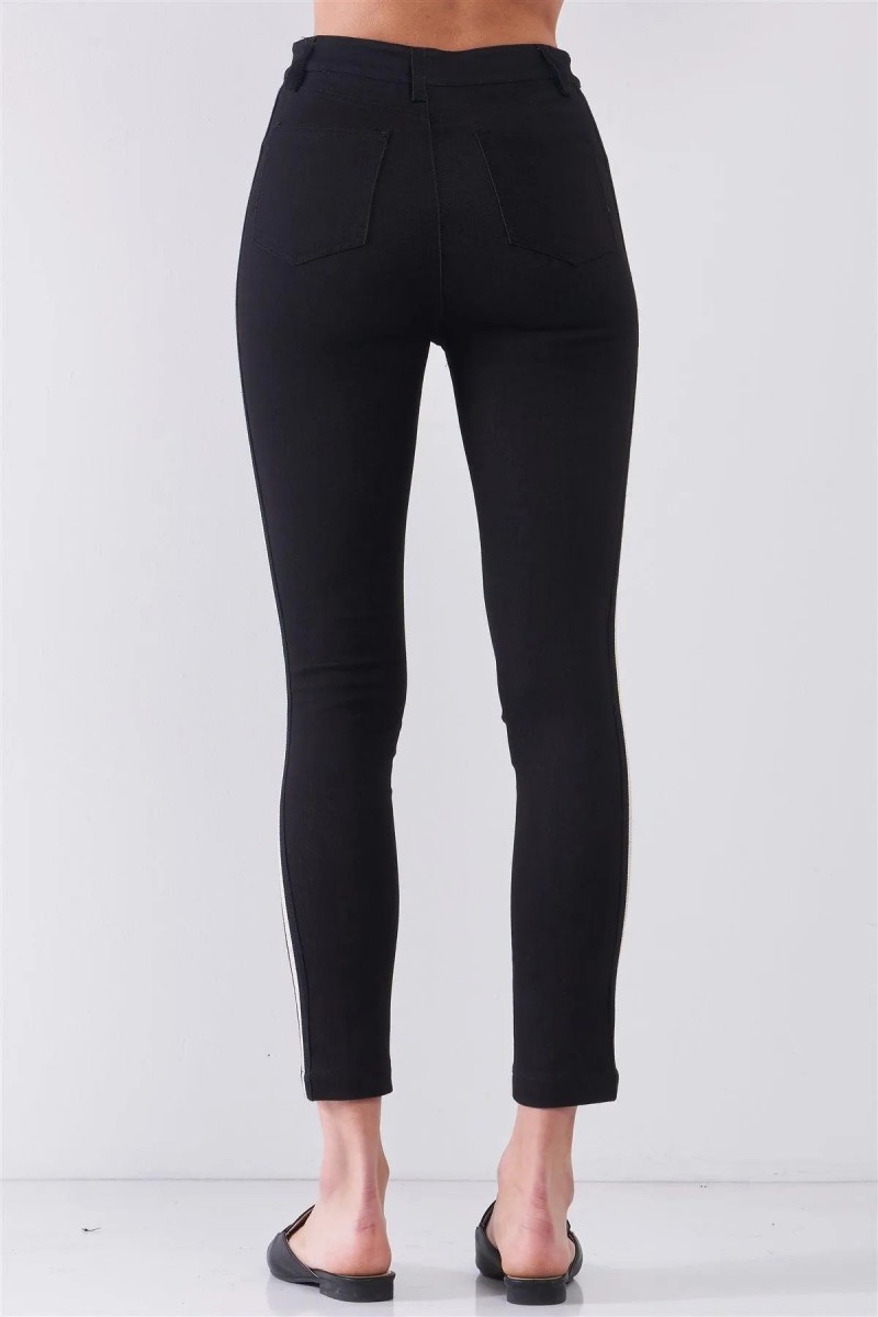 - Design: Black Mid-Rise Glitter Multi-Stripe Side Trim Detail Skinny Pants — a bold and stylish piece with eye-catching glitter stripes for a fun, edgy look.