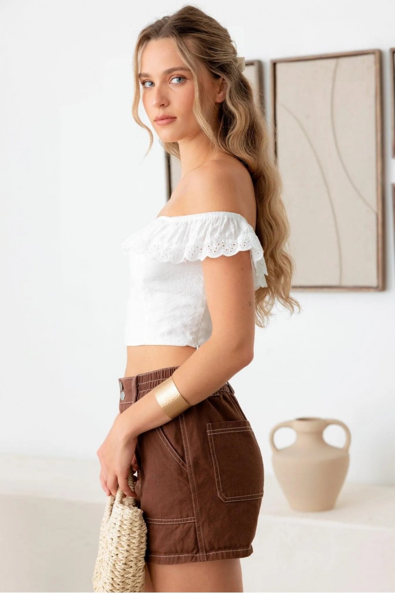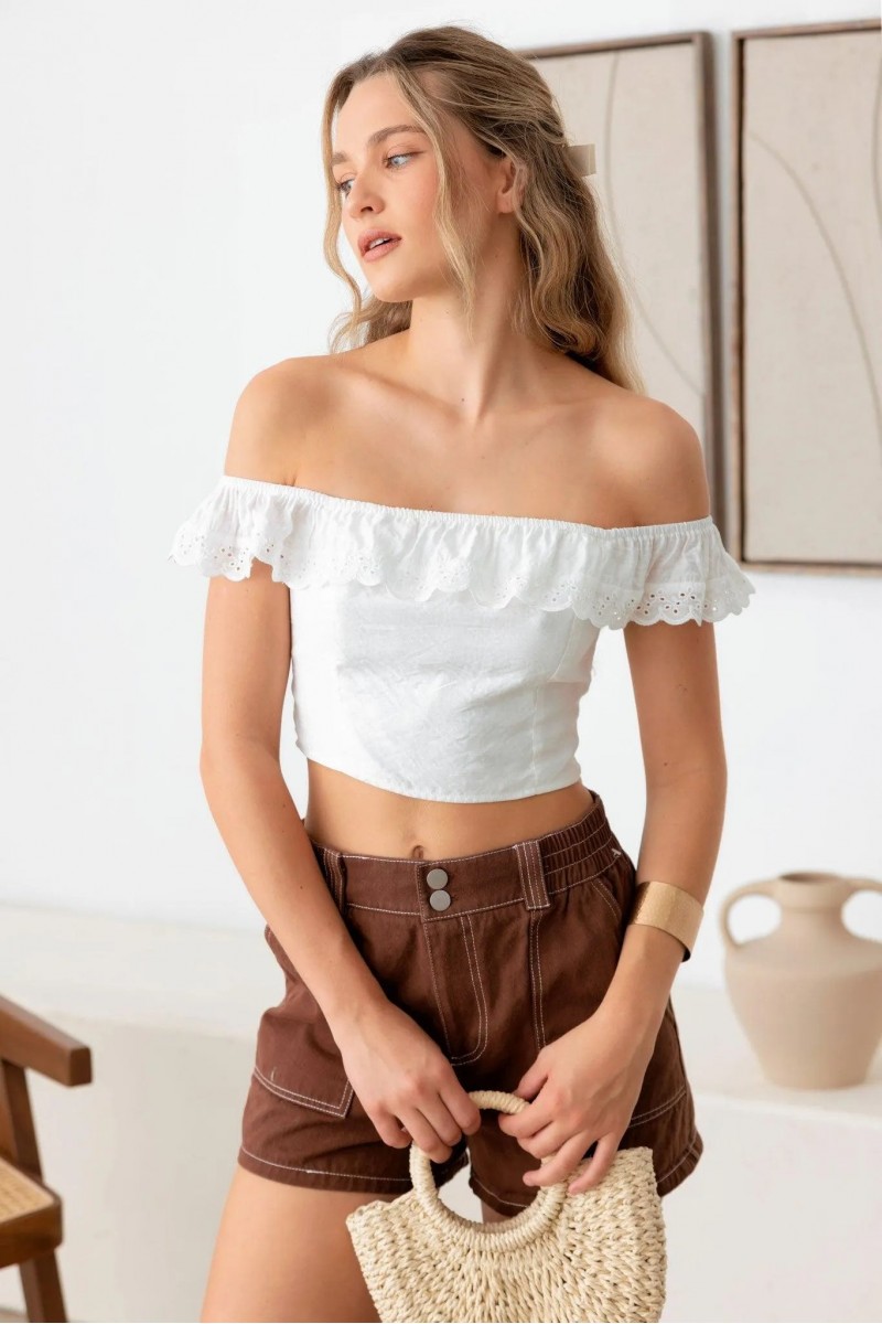 Add a touch of elegance to your wardrobe with our Off Shoulder Lace Ruffle Trim Crop Top. The delicate lace and ruffle trim exude sophistication and luxury. Perfect for any occasion, this top will make you feel like a work of art. Elevate your style and make a statement with this premium piece.
