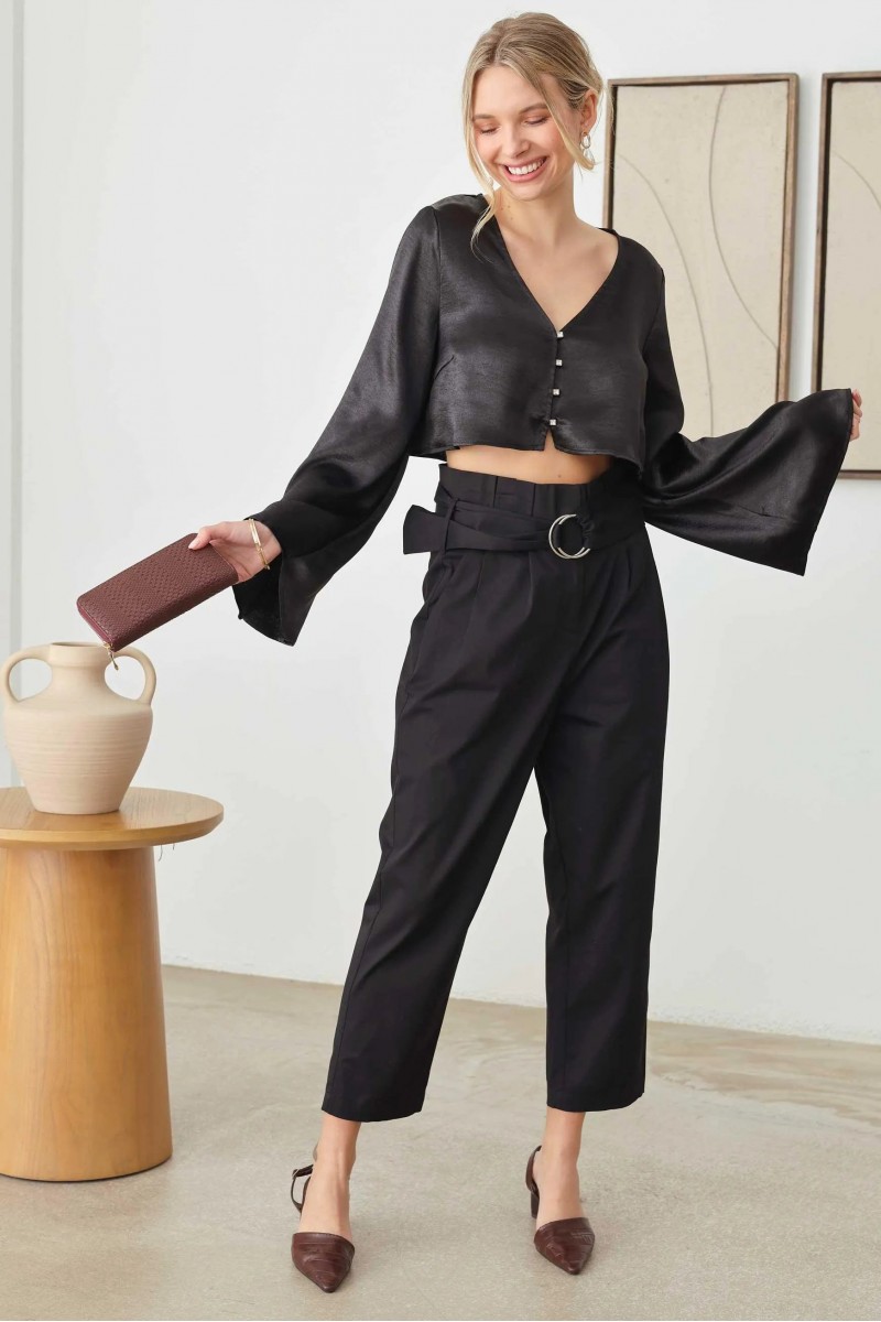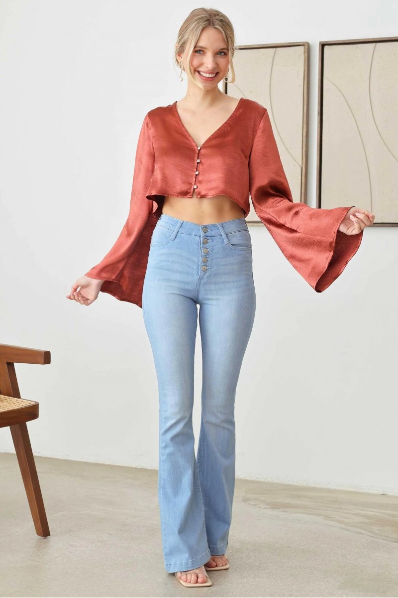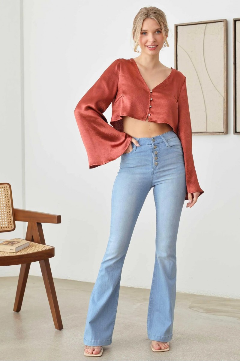 Design: The Satin Rhinestone Buttons Closure Crop Top combines luxury with sparkle. Featuring a sleek satin finish, this top is designed with rhinestone button closures for a touch of glam.