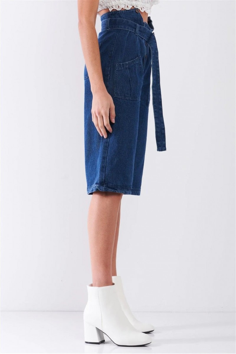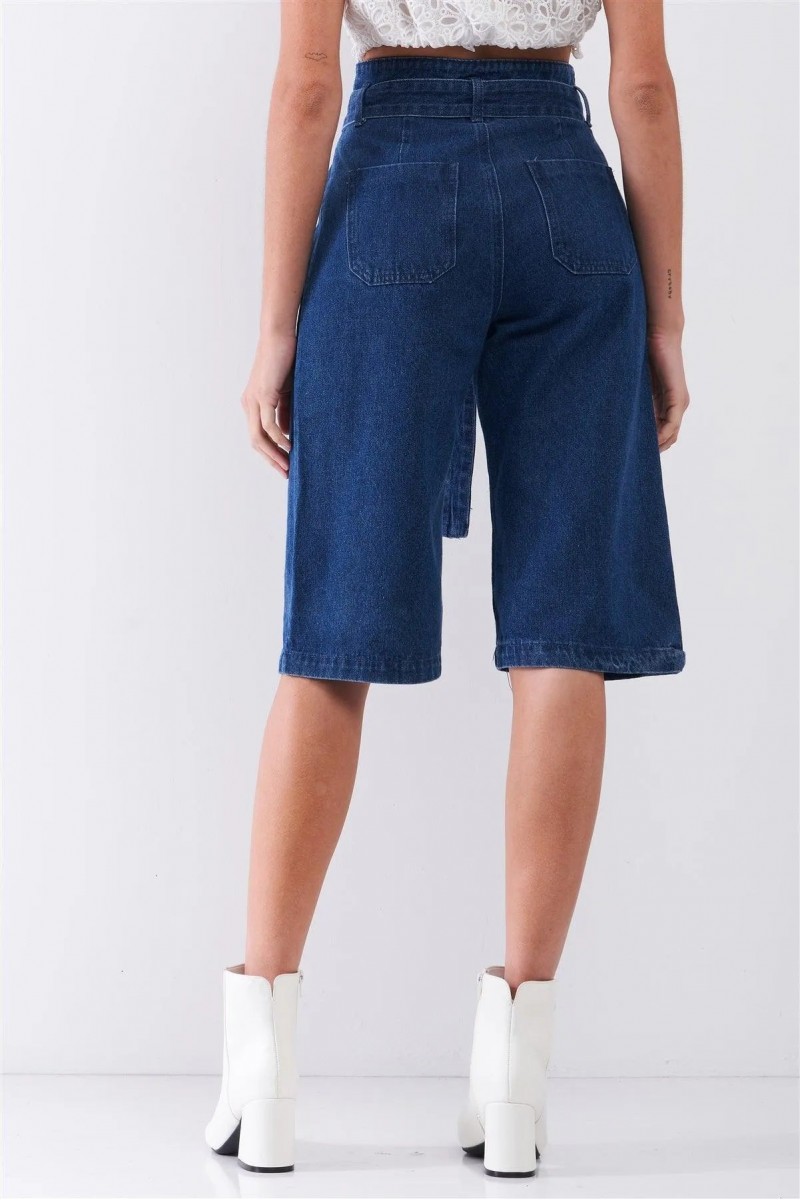 Design: Dark Blue Denim Front Cut-Out High-Waist Buckle Self-Tie Belt Detail Midi Flare Jean Pants — a unique pair of jeans featuring stylish front cut-outs and a high-waisted fit.