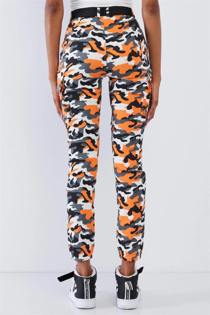 Design: Orange Camo High Waisted Belted Cargo Pants — bold and edgy, featuring a striking camouflage print in vibrant orange tones for a standout look.