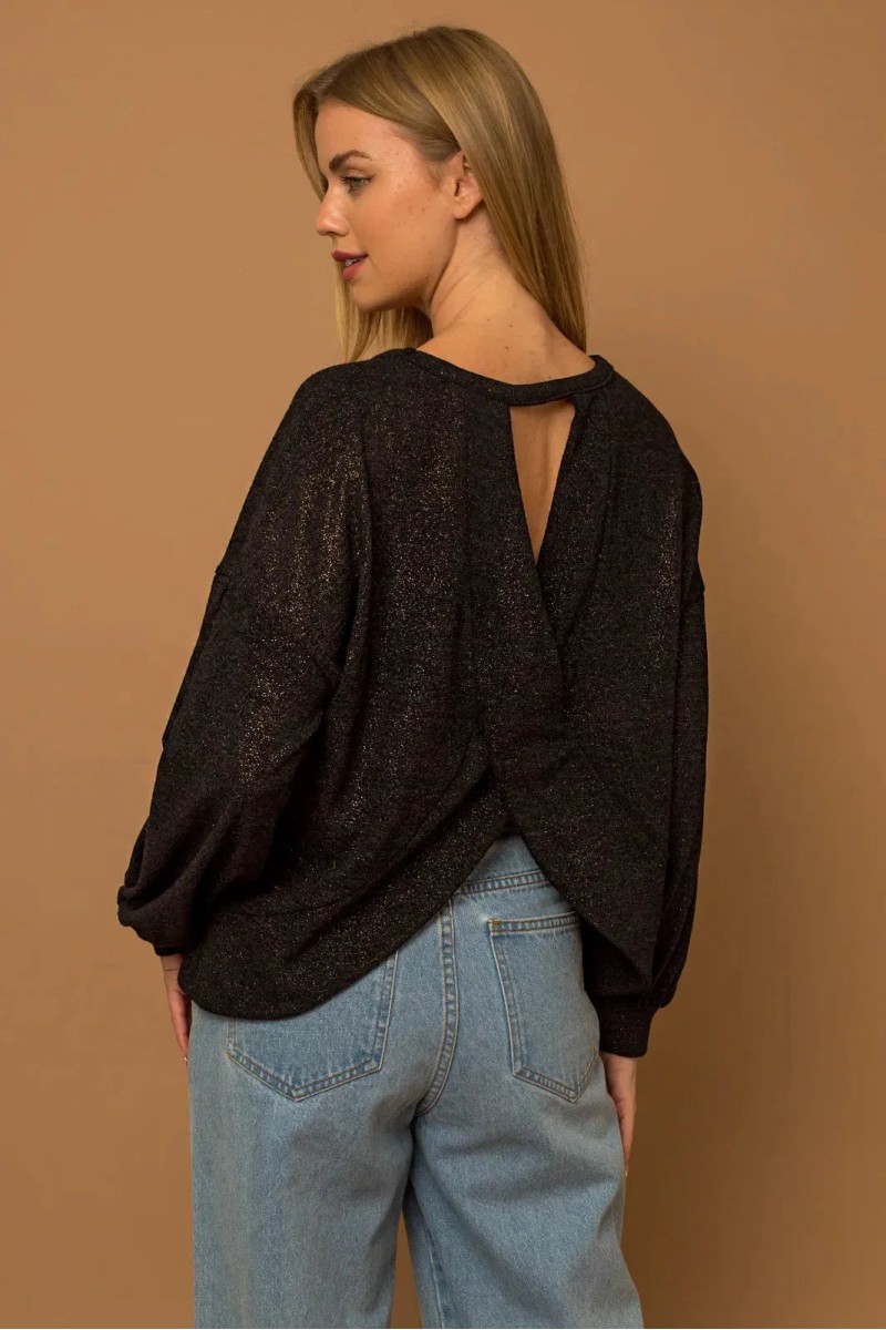 Add some sparkle to your wardrobe with our Glitter Long Sleeve Open Back Knit Top. This top features a hint of glitter for a touch of glamour, while the open back design adds a flirty and trendy twist to your outfit. Perfect for a night out or a special occasion, this top will make you stand out in style.