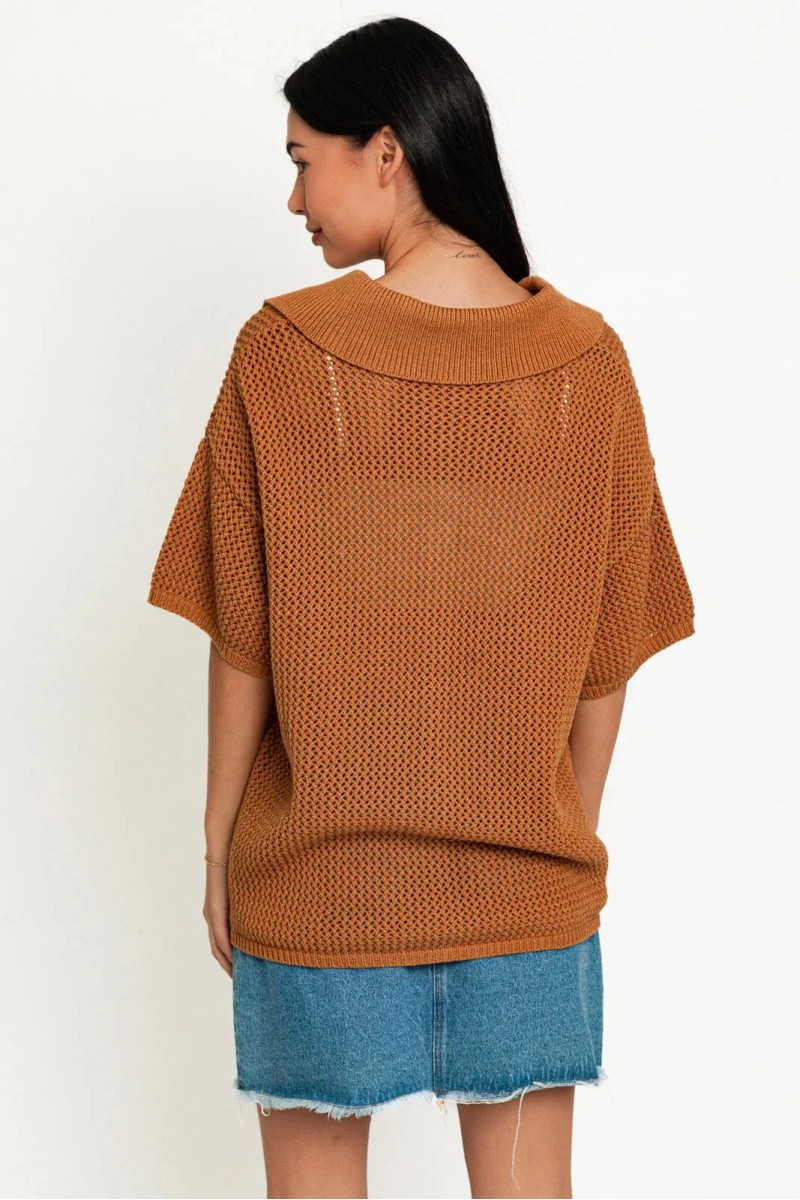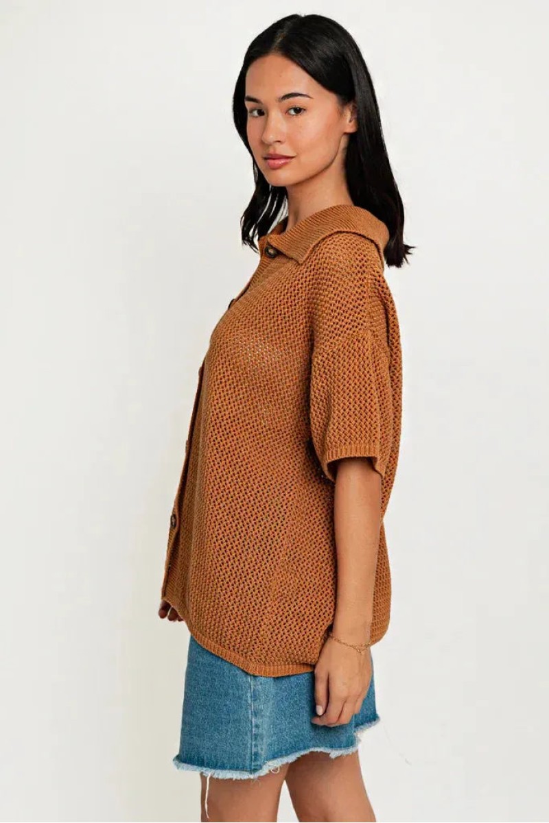 Unwind in style with this playful Short Sleeve Button Down Relax Collared Sweater Top. Its relaxed fit and soft material will keep you comfortable while the button down and collared design add a touch of sophistication. Perfect for a casual day out or a cozy night in.