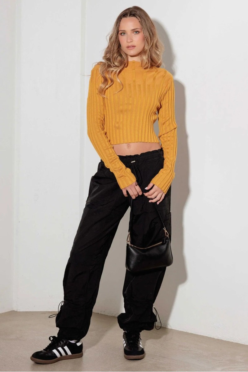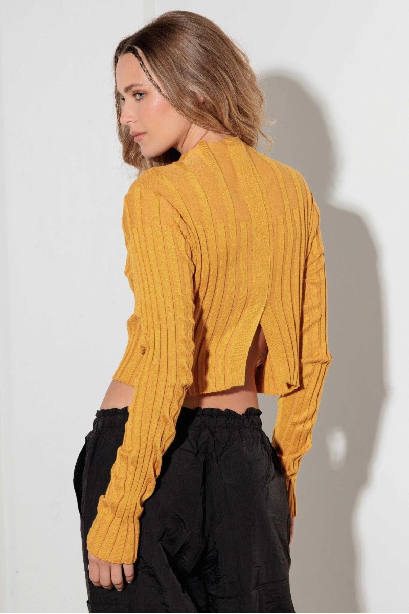 This long sleeve crop sweater features a unique cut out design and ribbed texture, creating a stylish and flattering look. With its soft material, it provides both comfort and fashion, making it a must-have for any wardrobe. Stay on-trend with this versatile and chic sweater.