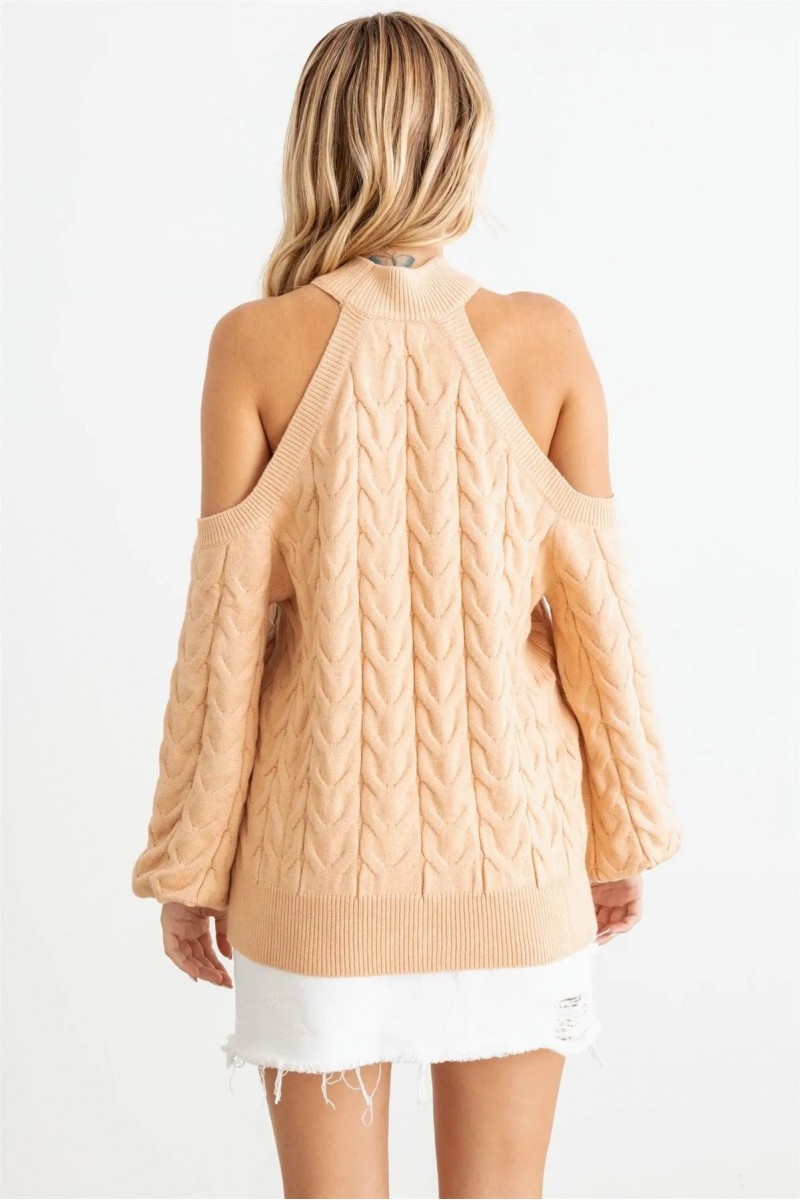 Design: Cable Knit Mock Neck Cold Shoulder Long Sleeve Sweater — a trendy sweater combining classic cable knit with modern cold shoulder cut-outs.