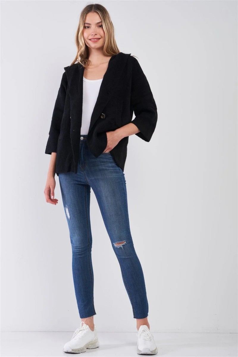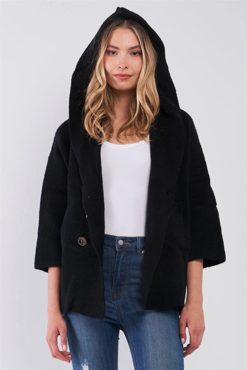 • Design: Black Knit Buttoned Front 3/4 Sleeve Hooded Cardigan — a cozy, stylish cardigan perfect for layering during cooler months.