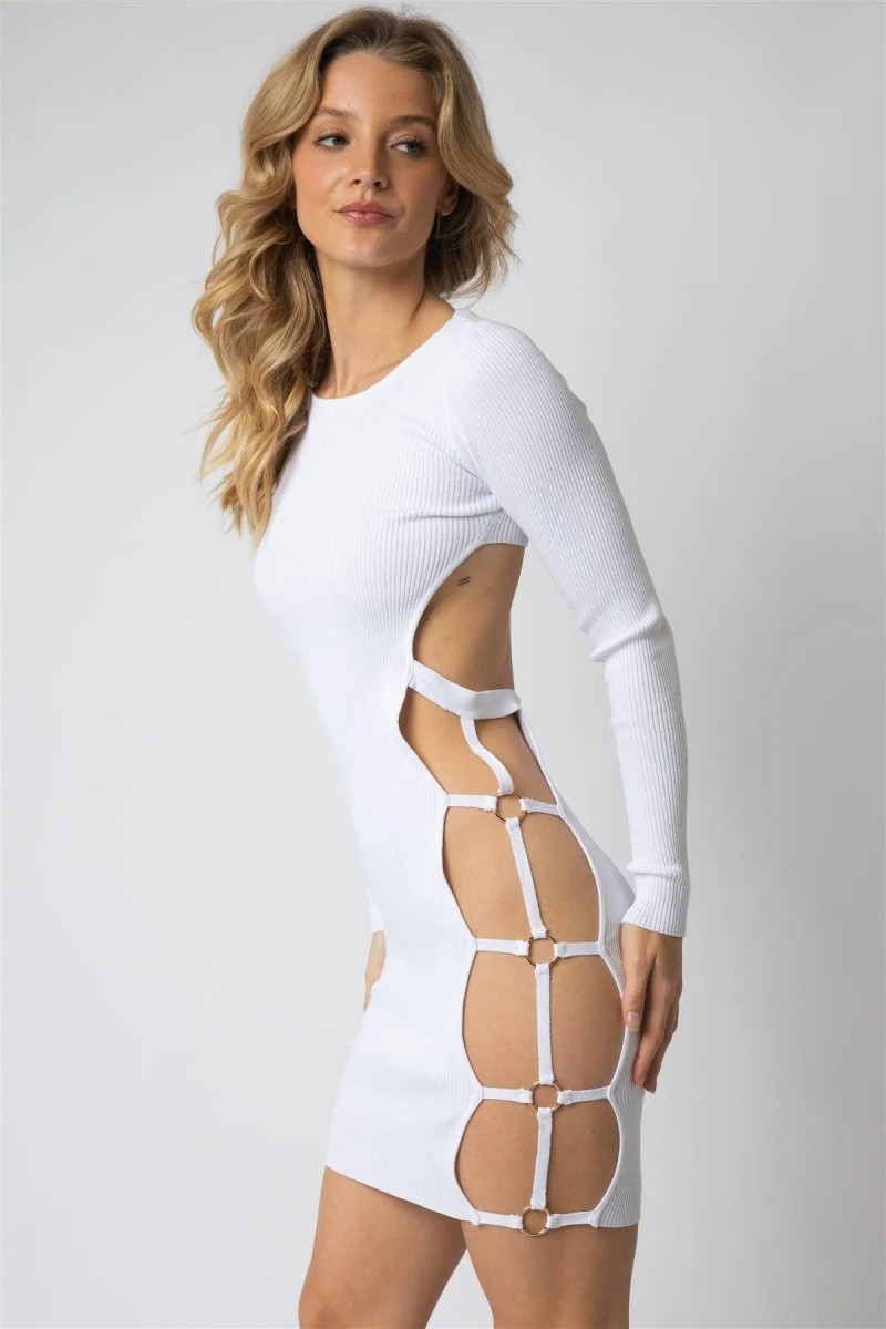 • Design: White Knit Side Cut-Out With Gold Accent Ring Open Back Mini Dress — a chic and bold dress with unique side cut-outs and a stylish open back.